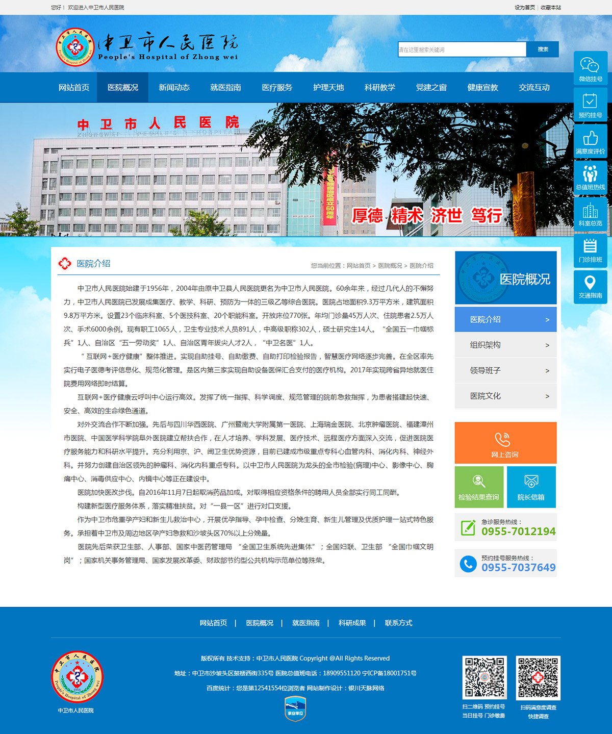 中衛(wèi)市人民醫(yī)院始建于1956年,2004年由原中衛(wèi)縣人民醫(yī)院更名為中衛(wèi)市人民醫(yī)院。60余年來,經(jīng)過幾代人的不懈努力,中衛(wèi)市人民醫(yī)院已發(fā)展成集醫(yī)療、教學(xué)、科研、預(yù)防為一體的三級乙等綜合醫(yī)院。醫(yī)院占地面積9.3萬平方米,建筑面積9.8萬平方米。設(shè)置23個臨床科室、5個醫(yī)技科室、20個職能科室。開放床位770張。年均門診量45萬人次、住院患者2.5萬人次、手術(shù)6000余例?,F(xiàn)有職工1065人,衛(wèi)生專業(yè)技術(shù)人員891人,中高級職稱302人,碩士研究生14人。“全國五一巾幗標(biāo)兵”1人、自治區(qū)“五一勞動獎”1人、